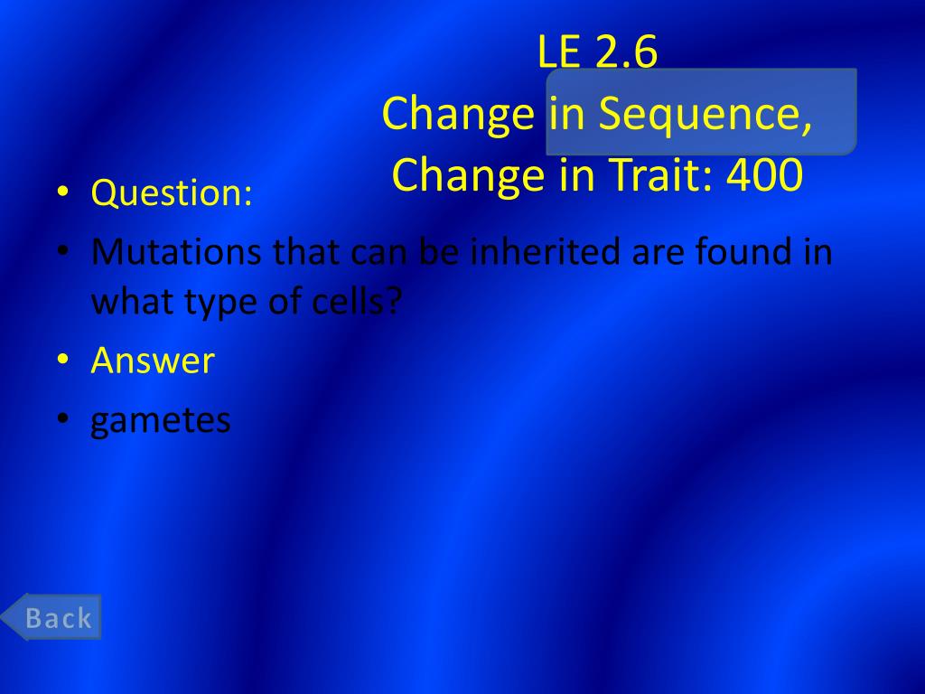 LE 2.6Change in Sequence, Change in Trait: 400 • Question: • Mutations that can be inherited are found in what type of cells? • Answer • gametes Back