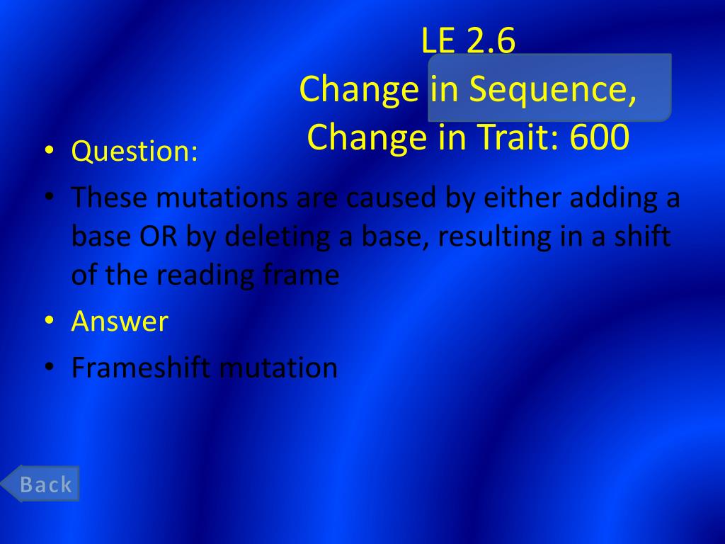LE 2.6Change in Sequence, Change in Trait: 600 • Question: • These mutations are caused by either adding a base OR by deleting a base, resulting in a shift of the reading frame • Answer • Frameshift mutation Back