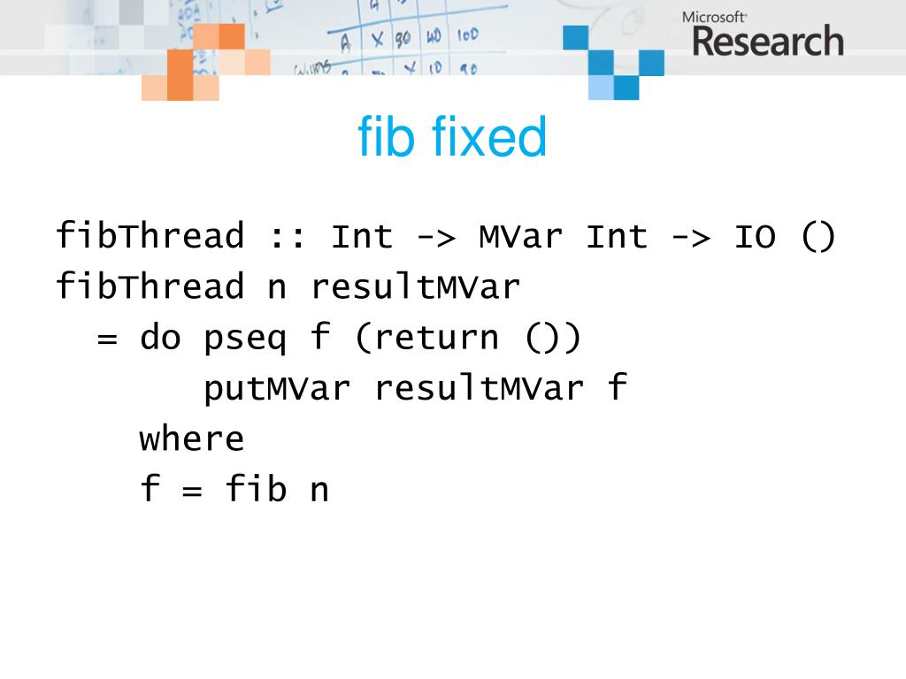 fib fixed fibThread :: Int -> MVarInt -> IO () fibThread n resultMVar = do pseq f (return ()) putMVarresultMVar f where f = fib n