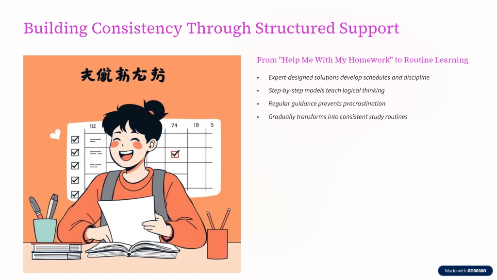 Building Consistency Through Structured Support From "Help Me With My Homework" to Routine Learning • Expert-designed solutions develop schedules and discipline • Step-by-step models teach logical thinking • Regular guidance prevents procrastination • Gradually transforms into consistent study routines