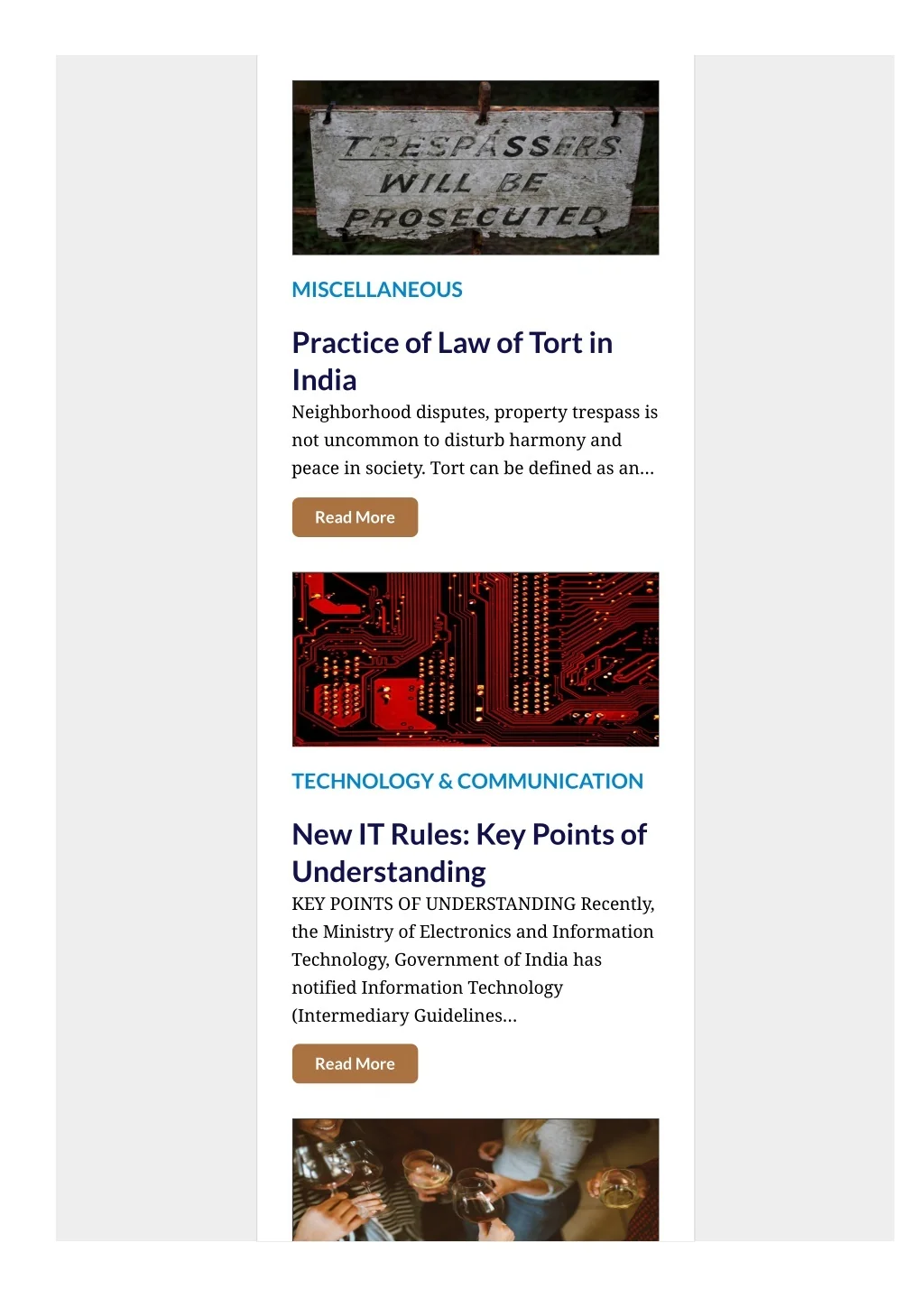 MISCELLANEOUS Practice of Law of Tort in India Neighborhood disputes, property trespass is not uncommon to disturb harmony and peace in society. Tort can be defined as an… Read More TECHNOLOGY & COMMUNICATION New IT Rules: Key Points of Understanding KEY POINTS OF UNDERSTANDING Recently, the Ministry of Electronics and Information Technology, Government of India has notified Information Technology (Intermediary Guidelines… Read More