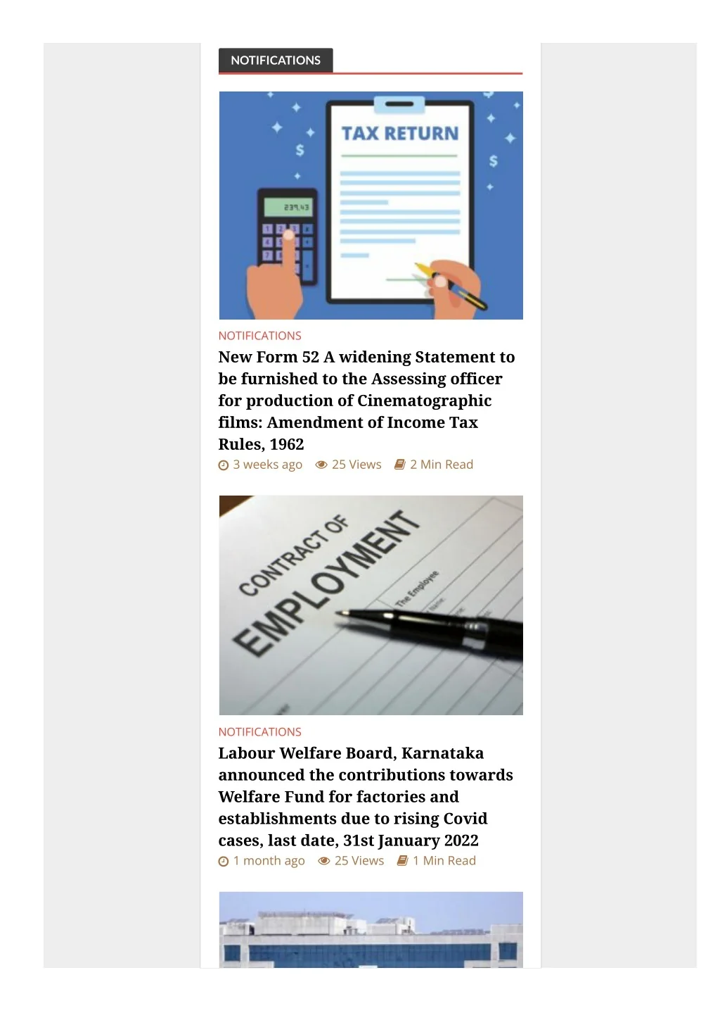 NOTIFICATIONS NOTIFICATIONS New Form 52 A widening Statement to be furnished to the Assessing officer for production of Cinematographic films: Amendment of Income Tax Rules, 1962 3 weeks ago 25 Views 2 Min Read NOTIFICATIONS Labour Welfare Board, Karnataka announced the contributions towards Welfare Fund for factories and establishments due to rising Covid cases, last date, 31st January 2022 1 month ago 25 Views 1 Min Read