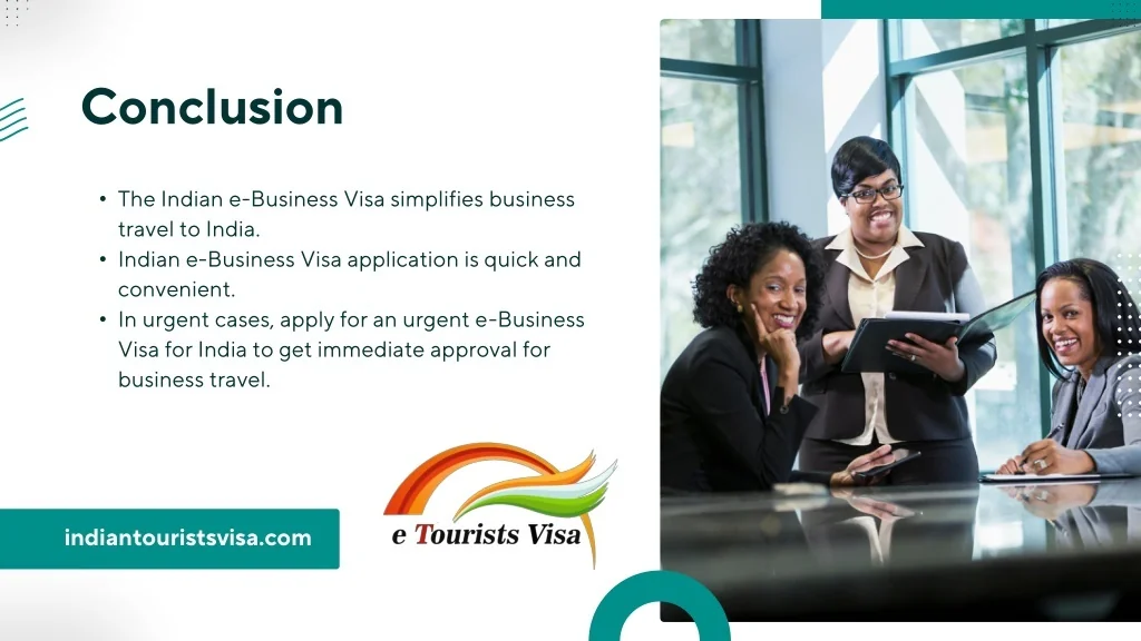 Conclusion • The Indian e-Business Visa simplifies business travel to India. • Indian e-Business Visa application is quick and convenient. • In urgent cases, apply for an urgent e-Business Visa for India to get immediate approval for business travel. indiantouristsvisa.com