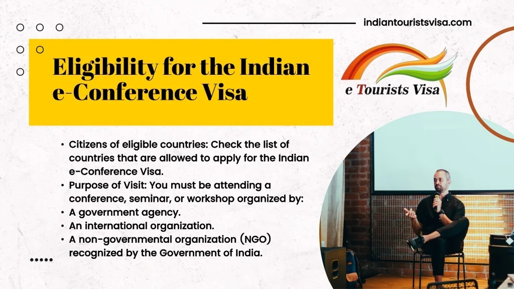 indiantouristsvisa.com Eligibility for the Indian e-Conference Visa • Citizens of eligible countries: Check the list of countries that are allowed to apply for the Indian e-Conference Visa. • Purpose of Visit: You must be attending a conference, seminar, or workshop organized by: • A government agency. • An international organization. • A non-governmental organization (NGO) recognized by the Government of India.