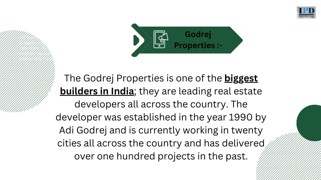 Overview Godrej Properties :- Introduce the project. Provide a quick background and rationale. Briefly share its overall scope as well as expected outcomes. The Godrej Properties is one of the biggest builders in India; they are leading real estate developers all across the country. The developer was established in the year 1990 by Adi Godrej and is currently working in twenty cities all across the country and has delivered over one hundred projects in the past.