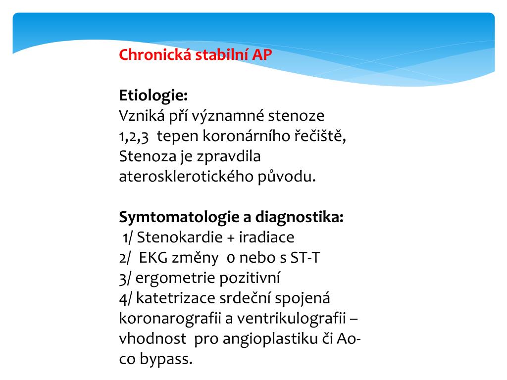 Chronická stabilní AP Etiologie: Vzniká pří významné stenoze 1,2,3 tepen koronárního řečiště, Stenoza je zpravdila aterosklerotického původu. Symtomatologie a diagnostika: 1/ Stenokardie + iradiace 2/ EKG změny 0 nebo s ST-T 3/ ergometrie pozitivní 4/ katetrizace srdeční spojená koronarografii a ventrikulografii – vhodnost pro angioplastiku či Ao-co bypass.