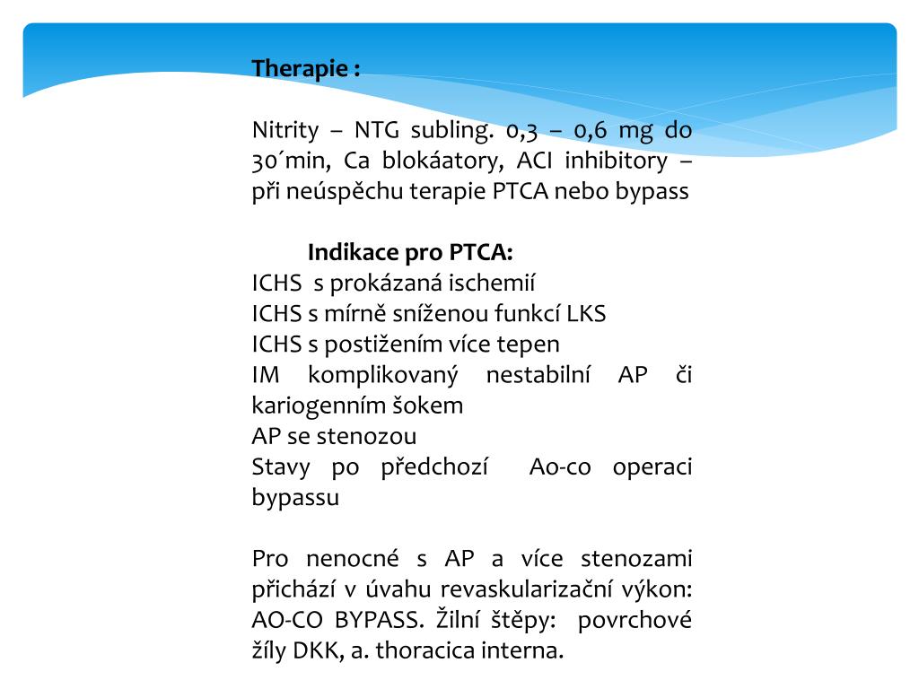 Therapie : • Nitrity – NTG subling. 0,3 – 0,6 mg do 30´min, Ca blokáatory, ACI inhibitory – při neúspěchu terapie PTCA nebo bypass • Indikace pro PTCA: • ICHS s prokázaná ischemií • ICHS s mírně sníženou funkcí LKS • ICHS s postižením více tepen • IM komplikovaný nestabilní AP či kariogenním šokem • AP se stenozou • Stavy po předchozí Ao-co operaci bypassu • Pro nenocné s AP a více stenozami přichází v úvahu revaskularizační výkon: AO-CO BYPASS. Žilní štěpy: povrchové žíly DKK, a. thoracica interna.