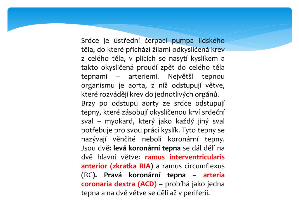 Srdce je ústřední čerpací pumpa lidského těla, do které přichází žilami odkysličená krev z celého těla, v plicích se nasytí kyslíkem a takto okysličená proudí zpět do celého těla tepnami – arteriemi. Největší tepnou organismu je aorta, z níž odstupují větve, které rozvádějí krev do jednotlivých orgánů. Brzy po odstupu aorty ze srdce odstupují tepny, které zásobují okysličenou krví srdeční sval – myokard, který jako každý jiný sval potřebuje pro svou práci kyslík. Tyto tepny se nazývají věnčité neboli koronární tepny. Jsou dvě: levá koronární tepna se dál dělí na dvě hlavní větve: ramusinterventricularisanterior (zkratka RIA) a ramuscircumflexus (RC). Pravá koronární tepna – arteriacoronariadextra (ACD) – probíhá jako jedna tepna a na dvě větve se dělí až v periferii.