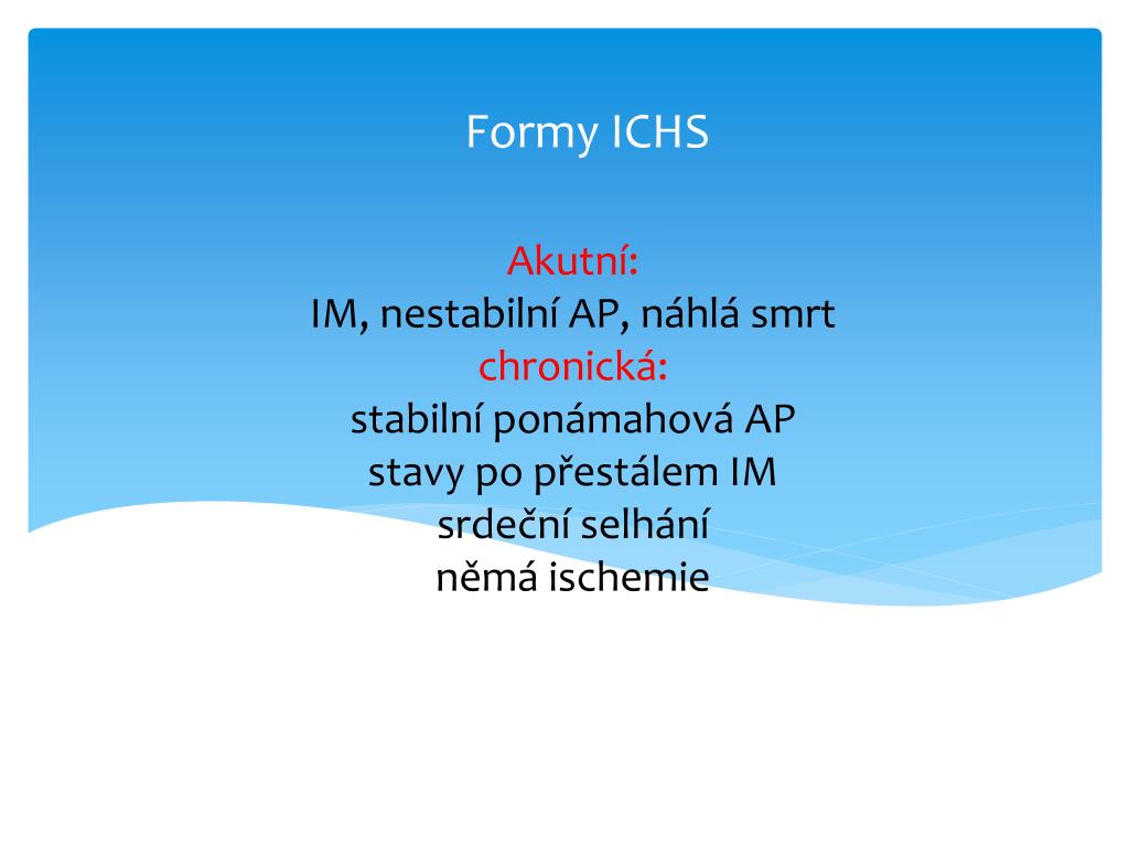 Formy ICHS Akutní: IM, nestabilní AP, náhlá smrtchronická:stabilní ponámahová APstavy po přestálem IMsrdeční selháníněmá ischemie