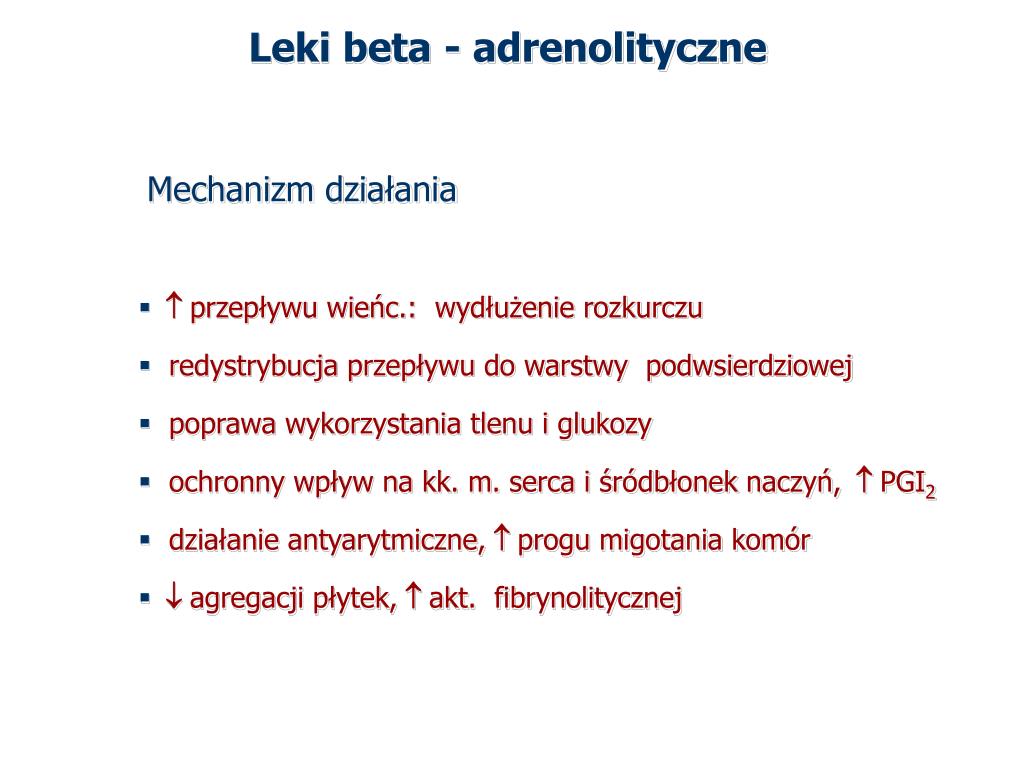 Leki beta - adrenolityczne Mechanizm działania • przepływu wieńc.: wydłużenie rozkurczu • redystrybucja przepływu do warstwy podwsierdziowej • poprawa wykorzystania tlenu i glukozy • ochronny wpływ na kk. m. serca i śródbłonek naczyń,PGI2 • działanie antyarytmiczne,progu migotania komór • agregacji płytek,akt. fibrynolitycznej