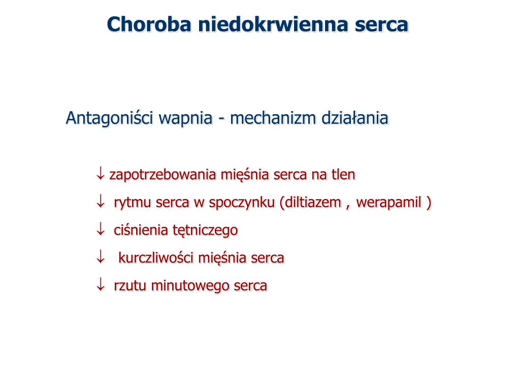 Choroba niedokrwienna serca Antagoniści wapnia - mechanizm działania zapotrzebowania mięśnia serca na tlen rytmu serca w spoczynku (diltiazem , werapamil ) ciśnienia tętniczego kurczliwości mięśnia serca rzutu minutowego serca