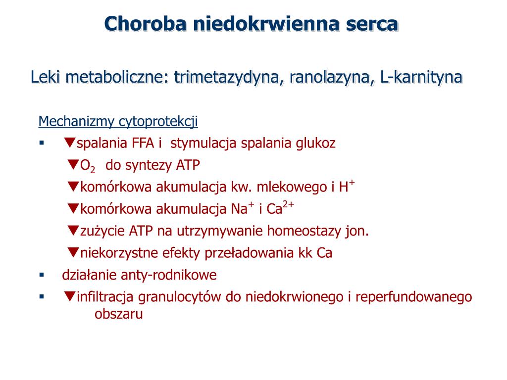 Choroba niedokrwienna serca Leki metaboliczne: trimetazydyna, ranolazyna, L-karnityna • Mechanizmy cytoprotekcji • qspalania FFA i stymulacja spalania glukoz qO2 do syntezy ATP qkomórkowa akumulacja kw. mlekowego i H+ qkomórkowa akumulacja Na+ i Ca2+ qzużycie ATP na utrzymywanie homeostazy jon. qniekorzystne efekty przeładowania kk Ca • działanie anty-rodnikowe • qinfiltracja granulocytów do niedokrwionego i reperfundowanego obszaru