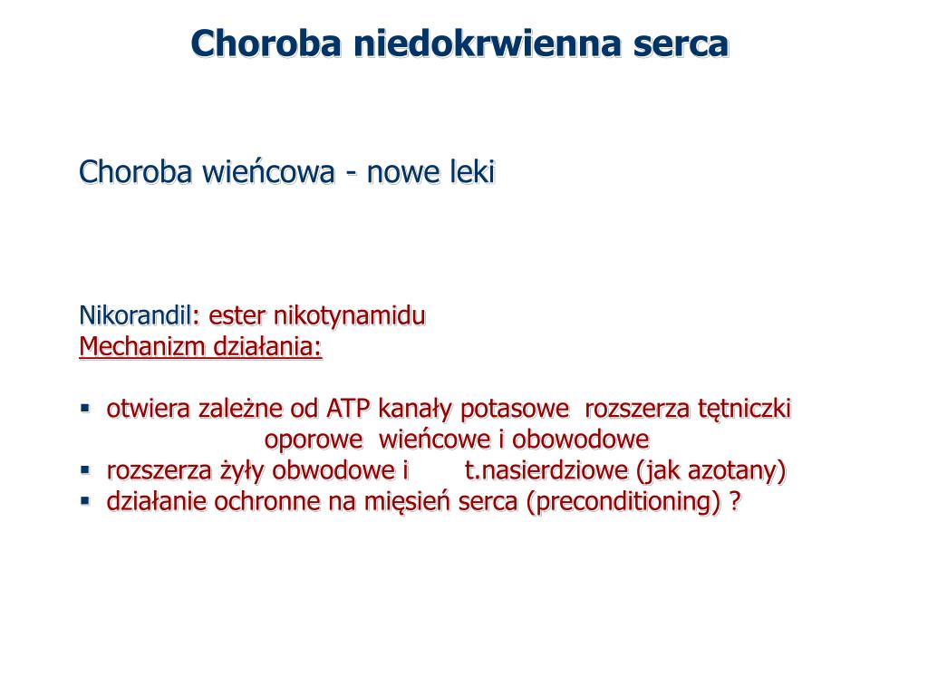 Choroba niedokrwienna serca Choroba wieńcowa - nowe leki Nikorandil: ester nikotynamidu Mechanizm działania: • otwiera zależne od ATP kanały potasowe rozszerza tętniczki oporowe wieńcowe i obowodowe • rozszerza żyły obwodowe i t.nasierdziowe (jak azotany) • działanie ochronne na mięsień serca (preconditioning) ?