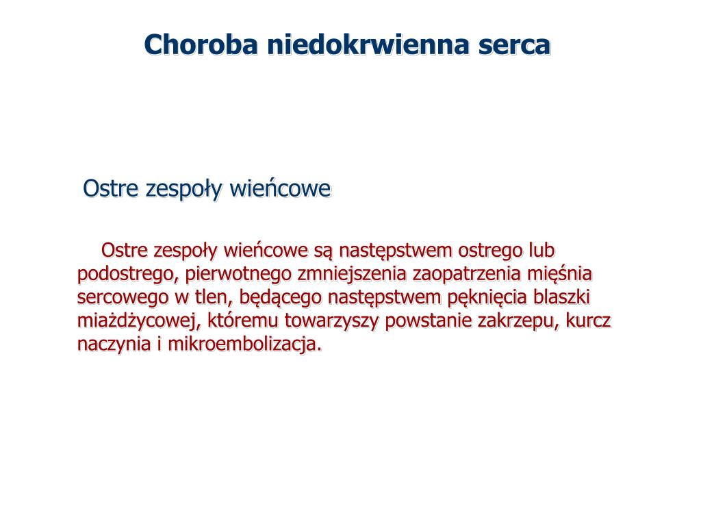 Choroba niedokrwienna serca Ostre zespoły wieńcowe Ostre zespoły wieńcowe są następstwem ostrego lub podostrego, pierwotnego zmniejszenia zaopatrzenia mięśnia sercowego w tlen, będącego następstwem pęknięcia blaszki miażdżycowej, któremu towarzyszy powstanie zakrzepu, kurcz naczynia i mikroembolizacja.
