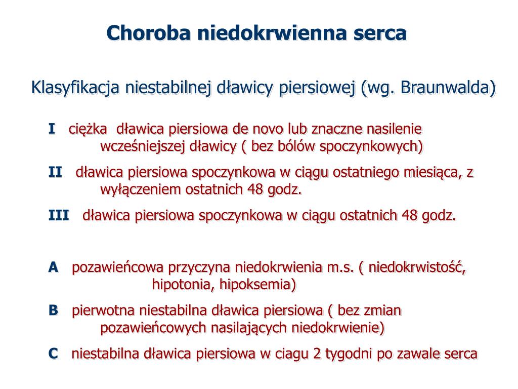 Choroba niedokrwienna serca Klasyfikacja niestabilnej dławicy piersiowej (wg. Braunwalda) I ciężka dławica piersiowa de novo lub znaczne nasilenie wcześniejszej dławicy ( bez bólów spoczynkowych) II dławica piersiowa spoczynkowa w ciągu ostatniego miesiąca, z wyłączeniem ostatnich 48 godz. III dławica piersiowa spoczynkowa w ciągu ostatnich 48 godz. A pozawieńcowa przyczyna niedokrwienia m.s. ( niedokrwistość, hipotonia, hipoksemia) B pierwotna niestabilna dławica piersiowa ( bez zmian pozawieńcowych nasilających niedokrwienie) C niestabilna dławica piersiowa w ciagu 2 tygodni po zawale serca