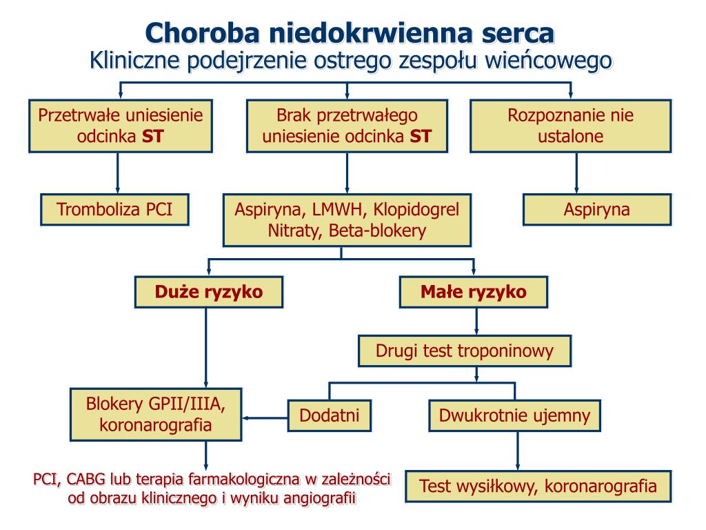 Choroba niedokrwienna serca Kliniczne podejrzenie ostrego zespołu wieńcowego Przetrwałe uniesienie odcinka ST Brak przetrwałego uniesienie odcinka ST Rozpoznanie nie ustalone Tromboliza PCI Aspiryna, LMWH, Klopidogrel Nitraty, Beta-blokery Aspiryna Duże ryzyko Małe ryzyko Drugi test troponinowy Blokery GPII/IIIA, koronarografia Dodatni Dwukrotnie ujemny PCI, CABG lub terapia farmakologiczna w zależności od obrazu klinicznego i wyniku angiografii Test wysiłkowy, koronarografia