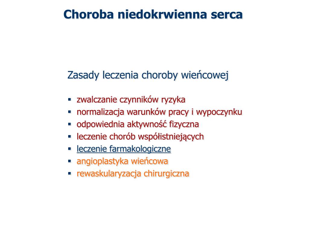 Choroba niedokrwienna serca Zasady leczenia choroby wieńcowej • zwalczanie czynników ryzyka • normalizacja warunków pracy i wypoczynku • odpowiednia aktywność fizyczna • leczenie chorób współistniejących • leczenie farmakologiczne • angioplastyka wieńcowa • rewaskularyzacja chirurgiczna