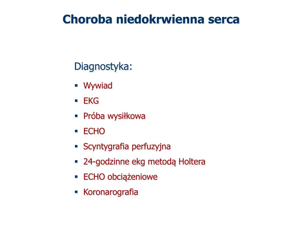 Choroba niedokrwienna serca Diagnostyka: • Wywiad • EKG • Próba wysiłkowa • ECHO • Scyntygrafia perfuzyjna • 24-godzinne ekg metodą Holtera • ECHO obciążeniowe • Koronarografia