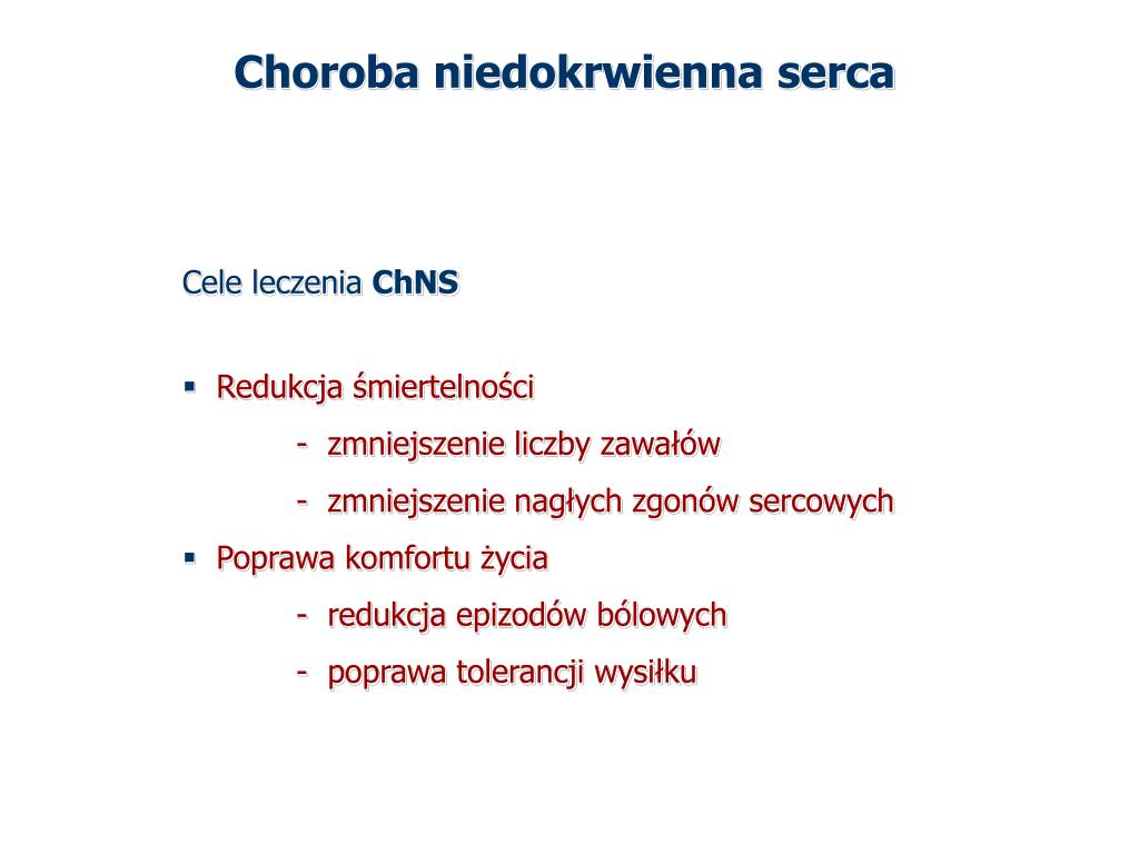 Choroba niedokrwienna serca Cele leczenia ChNS • Redukcja śmiertelności - zmniejszenie liczby zawałów - zmniejszenie nagłych zgonów sercowych • Poprawa komfortu życia - redukcja epizodów bólowych - poprawa tolerancji wysiłku