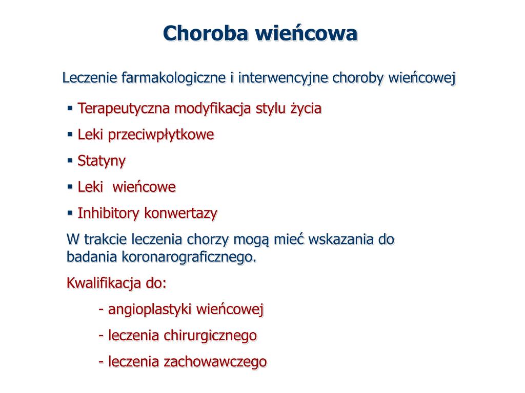 Choroba wieńcowa Leczenie farmakologiczne i interwencyjne choroby wieńcowej • Terapeutyczna modyfikacja stylu życia • Leki przeciwpłytkowe • Statyny • Leki wieńcowe • Inhibitory konwertazy W trakcie leczenia chorzy mogą mieć wskazania do badania koronarograficznego. Kwalifikacja do: - angioplastyki wieńcowej - leczenia chirurgicznego - leczenia zachowawczego