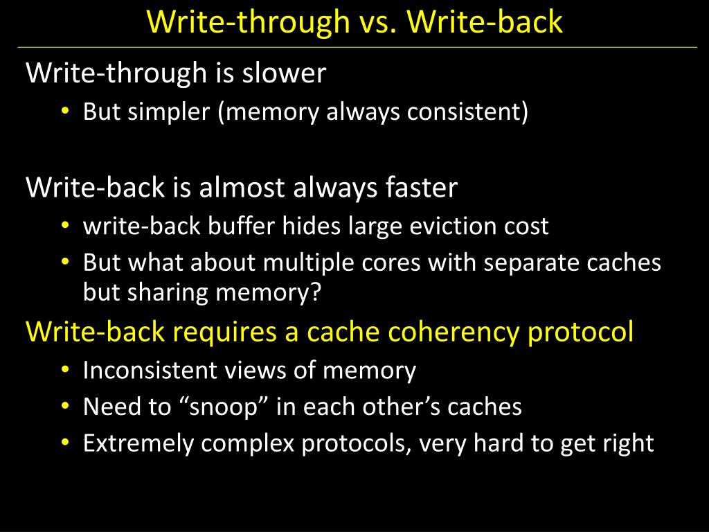 Write-through vs. Write-back • Write-through is slower • But simpler (memory always consistent) • Write-back is almost always faster • write-back buffer hides large eviction cost • But what about multiple cores with separate caches but sharing memory? • Write-back requires a cache coherency protocol • Inconsistent views of memory • Need to “snoop” in each other’s caches • Extremely complex protocols, very hard to get right