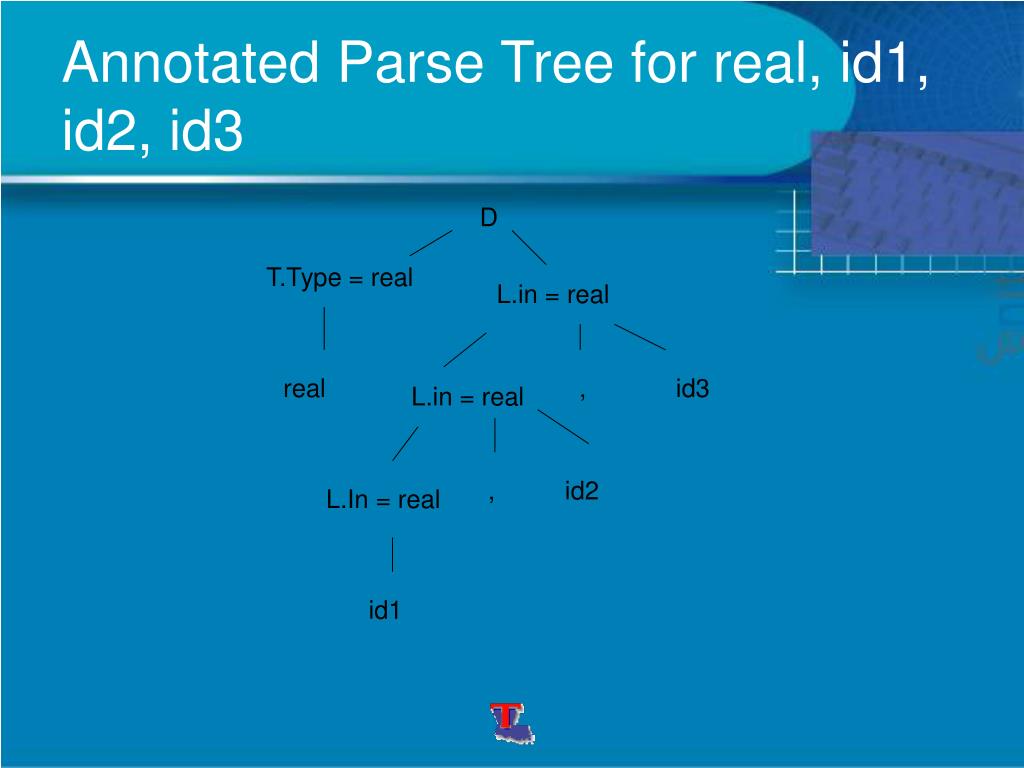 Annotated Parse Tree for real, id1, id2, id3 D T.Type = real L.in = real real , id3 L.in = real , id2 L.In = real id1