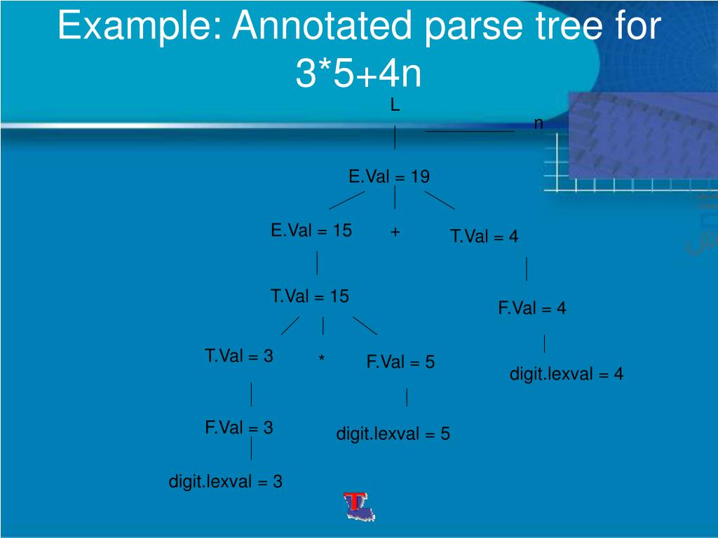 Example: Annotated parse tree for 3*5+4n L n E.Val = 19 E.Val = 15 + T.Val = 4 T.Val = 15 F.Val = 4 T.Val = 3 * F.Val = 5 digit.lexval = 4 F.Val = 3 digit.lexval = 5 digit.lexval = 3