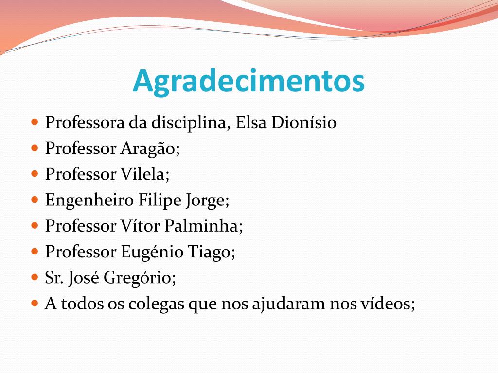 Agradecimentos • Professora da disciplina, Elsa Dionísio • Professor Aragão; • Professor Vilela; • Engenheiro Filipe Jorge; • Professor Vítor Palminha; • Professor Eugénio Tiago; • Sr. José Gregório; • A todos os colegas que nos ajudaram nos vídeos;