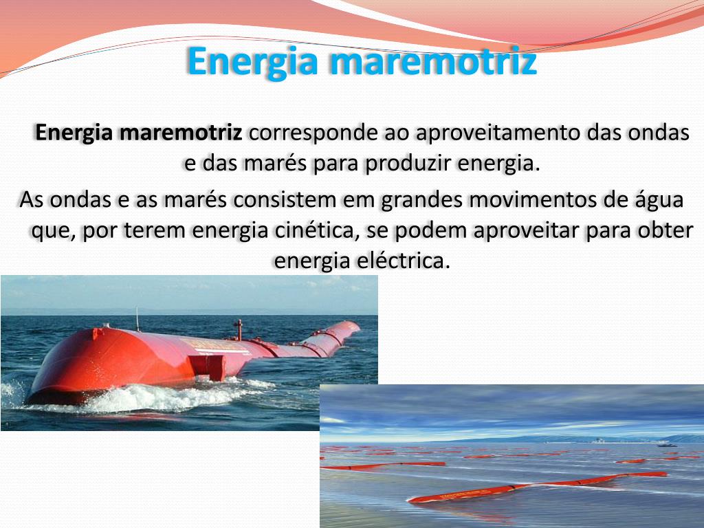 Energia maremotrizEnergia maremotriz corresponde ao aproveitamento das ondas e das marés para produzir energia. As ondas e as marés consistem em grandes movimentos de água que, por terem energia cinética, se podem aproveitar para obter energia eléctrica.