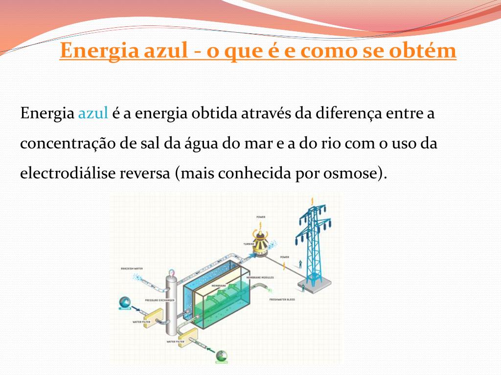 Energia azul - o que é e como se obtém Energia azul é a energia obtida através da diferença entre a concentração de sal da água do mar e a do rio com o uso da electrodiálise reversa (mais conhecida por osmose).
