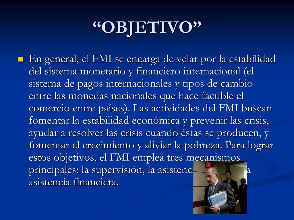 “OBJETIVO” • En general, el FMI se encarga de velar por la estabilidad del sistema monetario y financiero internacional (el sistema de pagos internacionales y tipos de cambio entre las monedas nacionales que hace factible el comercio entre países). Las actividades del FMI buscan fomentar la estabilidad económica y prevenir las crisis, ayudar a resolver las crisis cuando éstas se producen, y fomentar el crecimiento y aliviar la pobreza. Para lograr estos objetivos, el FMI emplea tres mecanismos principales: la supervisión, la asistencia técnica y la asistencia financiera.