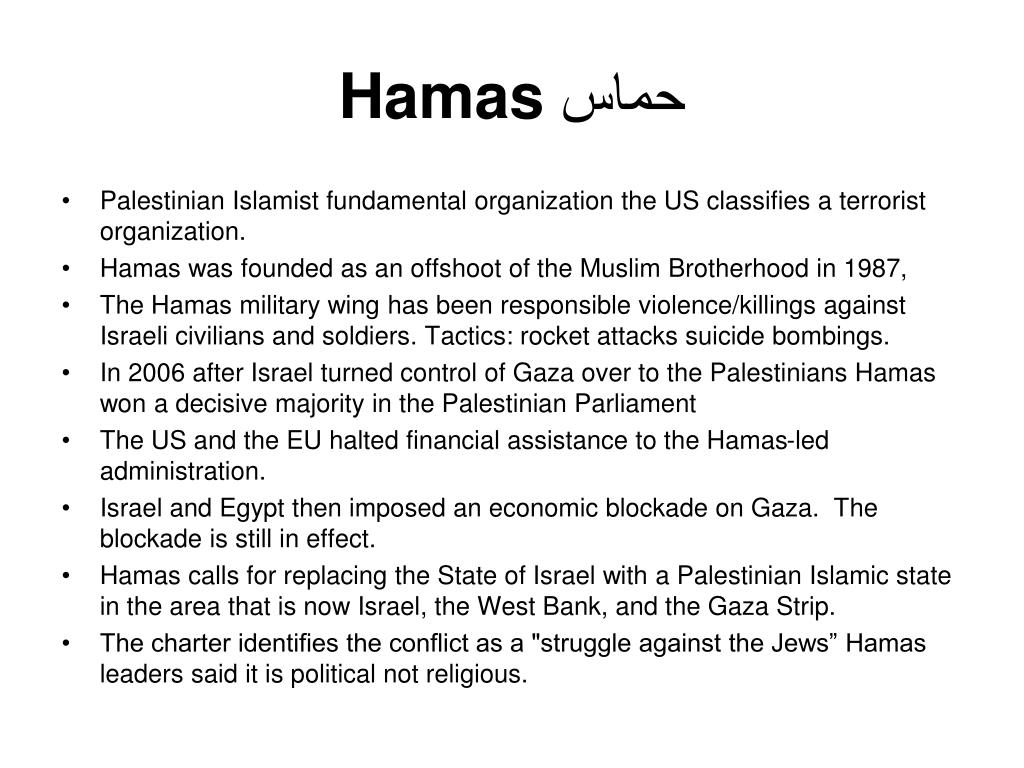 Hamasحماس • Palestinian Islamist fundamental organization the US classifies a terrorist organization. • Hamas was founded as an offshoot of the Muslim Brotherhood in 1987, • The Hamas military wing has been responsible violence/killings against Israeli civilians and soldiers. Tactics: rocket attacks suicide bombings. • In 2006 after Israel turned control of Gaza over to the Palestinians Hamas won a decisive majority in the Palestinian Parliament • The US and the EU halted financial assistance to the Hamas-led administration. • Israel and Egypt then imposed an economic blockade on Gaza. The blockade is still in effect. • Hamas calls for replacing the State of Israel with a Palestinian Islamic state in the area that is now Israel, the West Bank, and the Gaza Strip. • The charter identifies the conflict as a "struggle against the Jews” Hamas leaders said it is political not religious.