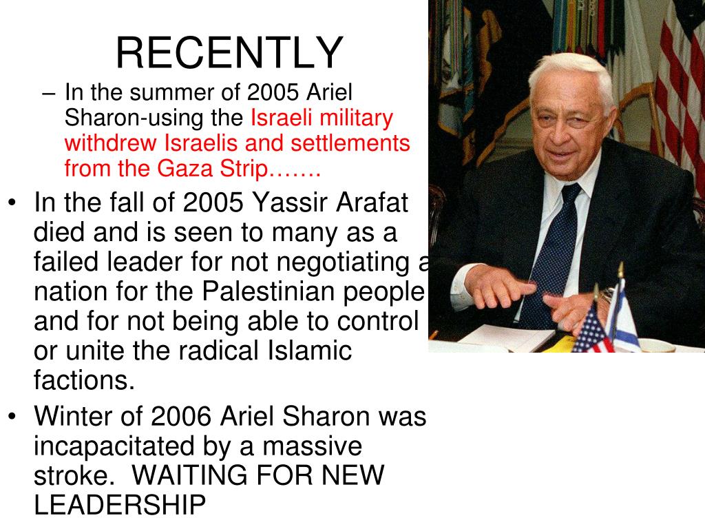 RECENTLY • In the summer of 2005 Ariel Sharon-using the Israeli military withdrew Israelis and settlements from the Gaza Strip……. • In the fall of 2005 Yassir Arafat died and is seen to many as a failed leader for not negotiating a nation for the Palestinian people and for not being able to control or unite the radical Islamic factions. • Winter of 2006 Ariel Sharon was incapacitated by a massive stroke. WAITING FOR NEW LEADERSHIP