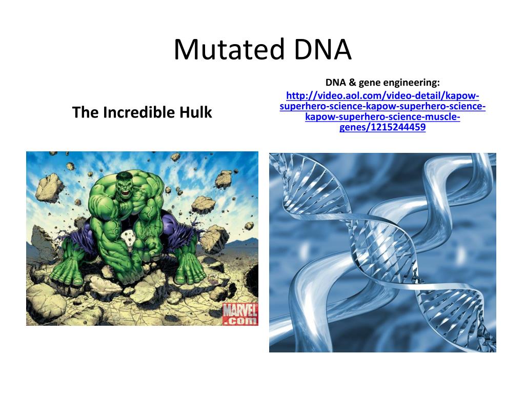 Mutated DNA The Incredible Hulk DNA & gene engineering: http://video.aol.com/video-detail/kapow-superhero-science-kapow-superhero-science-kapow-superhero-science-muscle-genes/1215244459
