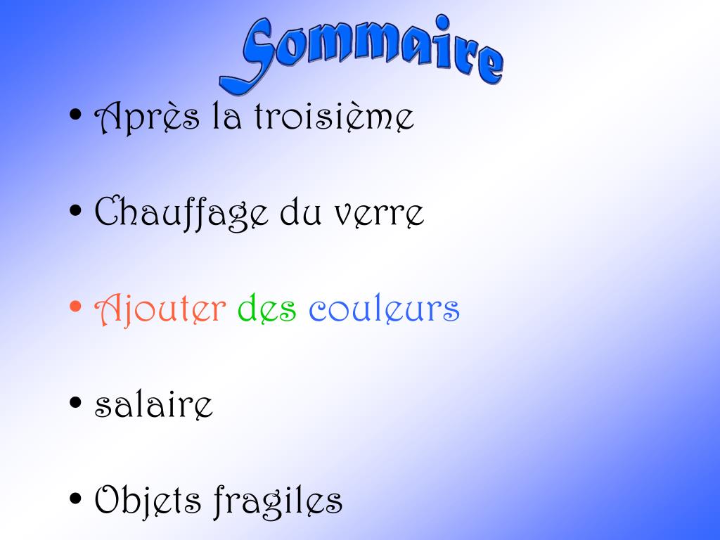 Après la troisième • Chauffage du verre • Ajouterdes couleurs • salaire • Objets fragiles