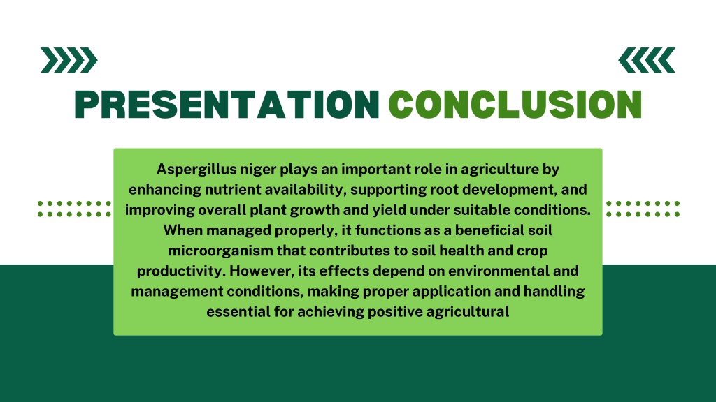 PRESENTATION CONCLUSION Aspergillus niger plays an important role in agriculture by enhancing nutrient availability, supporting root development, and improving overall plant growth and yield under suitable conditions. When managed properly, it functions as a beneficial soil microorganism that contributes to soil health and crop productivity. However, its effects depend on environmental and management conditions, making proper application and handling essential for achieving positive agricultural
