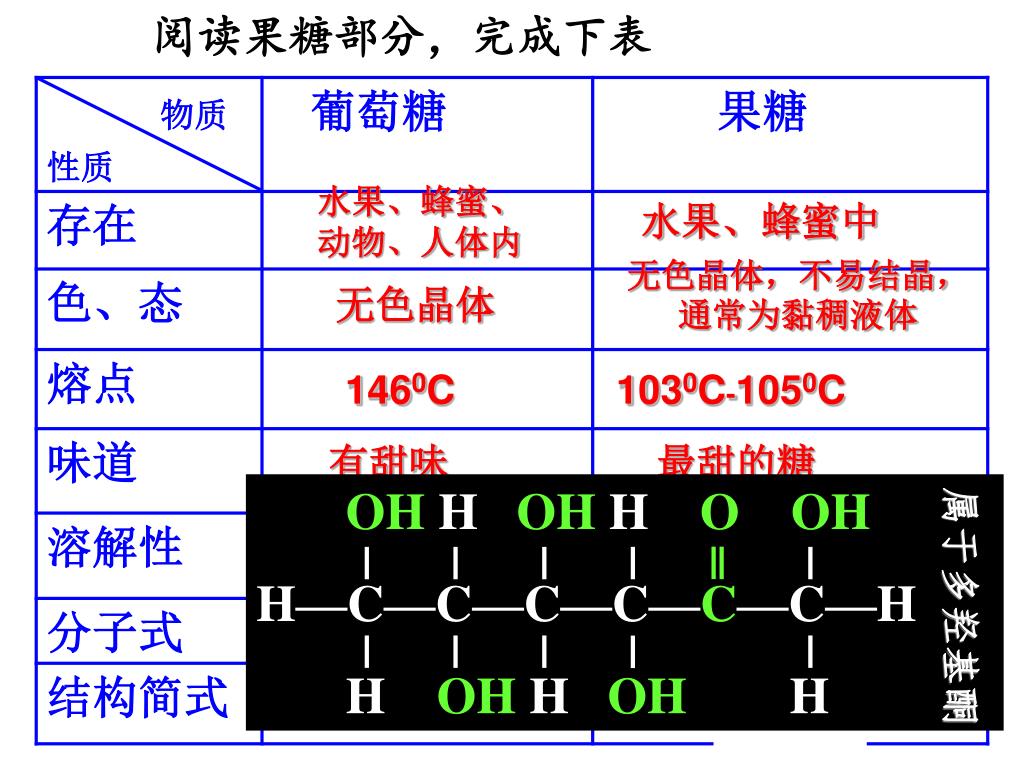 阅读果糖部分,完成下表 水果、蜂蜜、 动物、人体内 水果、蜂蜜中 无色晶体,不易结晶,通常为黏稠液体 无色晶体 1460C 1030C-1050C 有甜味 最甜的糖 属于多羟基酮 易溶于水,稍溶于乙醇,不溶于乙醚 易溶于水、乙醇、乙醚 OH H OH H OOH H—C—C—C—C—C—C—H H OH H OH H C6H12O6 C6H12O6