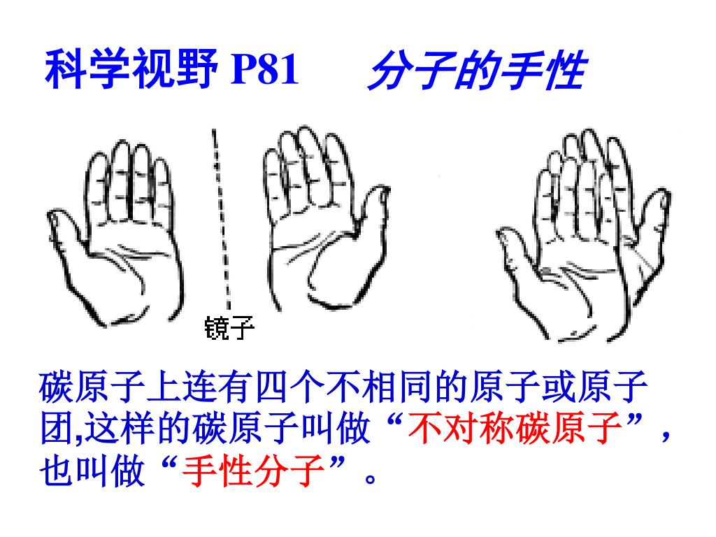 分子的手性 科学视野 P81 碳原子上连有四个不相同的原子或原子团,这样的碳原子叫做“不对称碳原子”,也叫做“手性分子”。