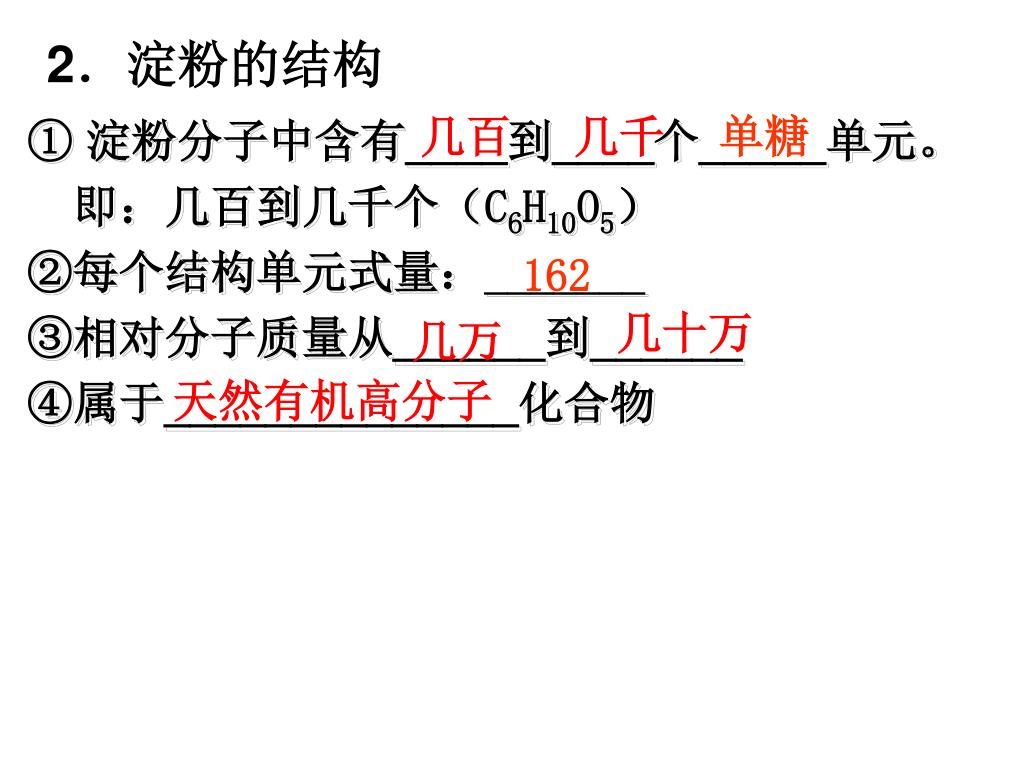 2.淀粉的结构 几百 几千 单糖 ①淀粉分子中含有____到____个_____单元。 即:几百到几千个(C6H10O5) ②每个结构单元式量:_______ ③相对分子质量从______到______ ④属于______________化合物 162 几十万 几万 天然有机高分子