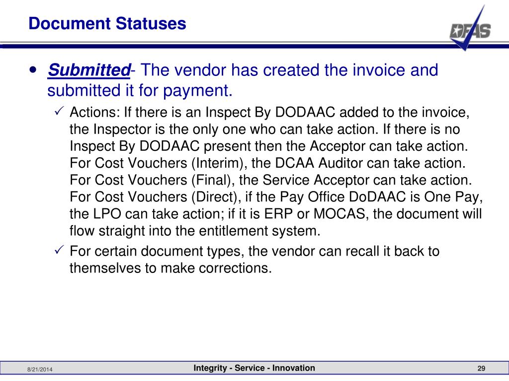 Document Statuses • Submitted- The vendor has created the invoice and submitted it for payment. • Actions: If there is an Inspect By DODAAC added to the invoice, the Inspector is the only one who can take action. If there is no Inspect By DODAAC present then the Acceptor can take action. For Cost Vouchers (Interim), the DCAA Auditor can take action. For Cost Vouchers (Final), the Service Acceptor can take action. For Cost Vouchers (Direct), if the Pay Office DoDAAC is One Pay, the LPO can take action; if it is ERP or MOCAS, the document will flow straight into the entitlement system. • For certain document types, the vendor can recall it back to themselves to make corrections. Integrity - Service - Innovation