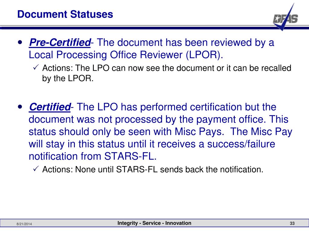 Document Statuses • Pre-Certified- The document has been reviewed by a Local Processing Office Reviewer (LPOR). • Actions: The LPO can now see the document or it can be recalled by the LPOR. • Certified- The LPO has performed certification but the document was not processed by the payment office. This status should only be seen with Misc Pays. The Misc Pay will stay in this status until it receives a success/failure notification from STARS-FL. • Actions: None until STARS-FL sends back the notification. Integrity - Service - Innovation