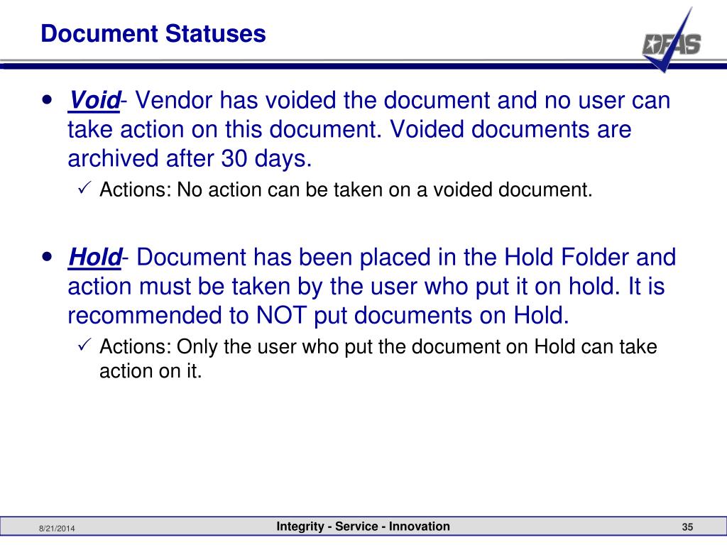 Document Statuses • Void- Vendor has voided the document and no user can take action on this document. Voided documents are archived after 30 days. • Actions: No action can be taken on a voided document. • Hold- Document has been placed in the Hold Folder and action must be taken by the user who put it on hold. It is recommended to NOT put documents on Hold. • Actions: Only the user who put the document on Hold can take action on it. Integrity - Service - Innovation