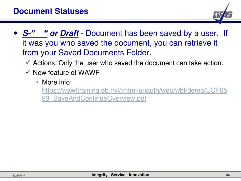 Document Statuses • S-” “ or Draft- Document has been saved by a user. If it was you who saved the document, you can retrieve it from your Saved Documents Folder. • Actions: Only the user who saved the document can take action. • New feature of WAWF • More info: https://wawftraining.eb.mil/xhtml/unauth/web/wbt/demo/ECP0593_SaveAndContinueOverview.pdf Integrity - Service - Innovation