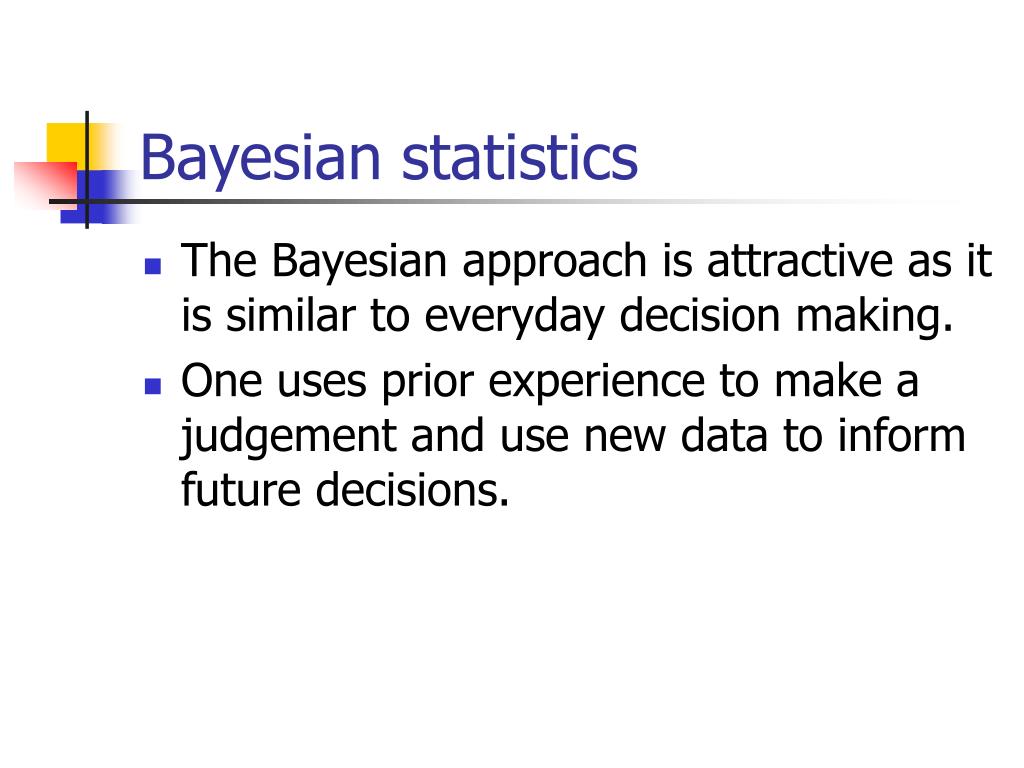 Bayesian statistics • The Bayesian approach is attractive as it is similar to everyday decision making. • One uses prior experience to make a judgement and use new data to inform future decisions.