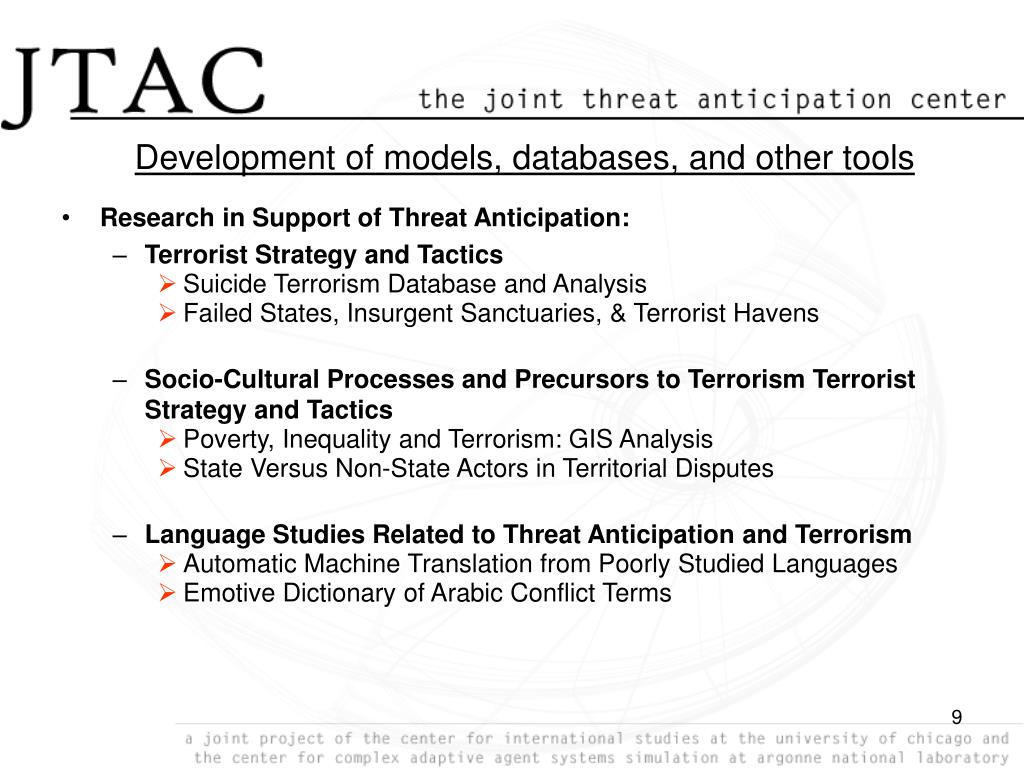 What is the Joint Threat Anticipation Center (JTAC)? • Joint venture of the University of Chicago and Argonne National Laboratory • Research, Education, Modeling, and Communication • Innovative, forward-thinking work on National Security Threats • Interdisciplinary, international • Leading the nation in integrating social science and technology • Constructing the foundations of computational social sciencefor applications to national security • Actively developing and recruiting a new generation of researchers • A unique institutional base; cooperative “Center of Excellence” • Dynamic and flexible in project selection and execution • Discovering the “hidden gems” of threat research • Creating a permanent “knowledge management” base
