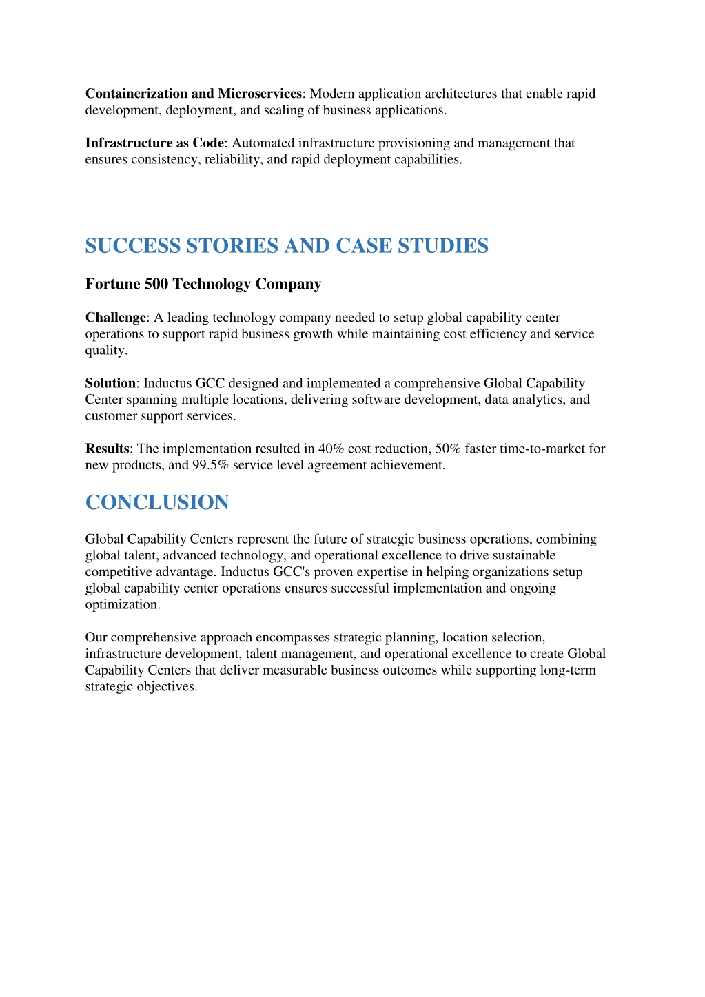 Containerization and Microservices: Modern application architectures that enable rapid development, deployment, and scaling of business applications. Infrastructure as Code: Automated infrastructure provisioning and management that ensures consistency, reliability, and rapid deployment capabilities. SUCCESS STORIES AND CASE STUDIES Fortune 500 Technology Company Challenge: A leading technology company needed to setup global capability center operations to support rapid business growth while maintaining cost efficiency and service quality. Solution: Inductus GCC designed and implemented a comprehensive Global Capability Center spanning multiple locations, delivering software development, data analytics, and customer support services. Results: The implementation resulted in 40% cost reduction, 50% faster time-to-market for new products, and 99.5% service level agreement achievement. CONCLUSION Global Capability Centers represent the future of strategic business operations, combining global talent, advanced technology, and operational excellence to drive sustainable competitive advantage. Inductus GCC's proven expertise in helping organizations setup global capability center operations ensures successful implementation and ongoing optimization. Our comprehensive approach encompasses strategic planning, location selection, infrastructure development, talent management, and operational excellence to create Global Capability Centers that deliver measurable business outcomes while supporting long-term strategic objectives.