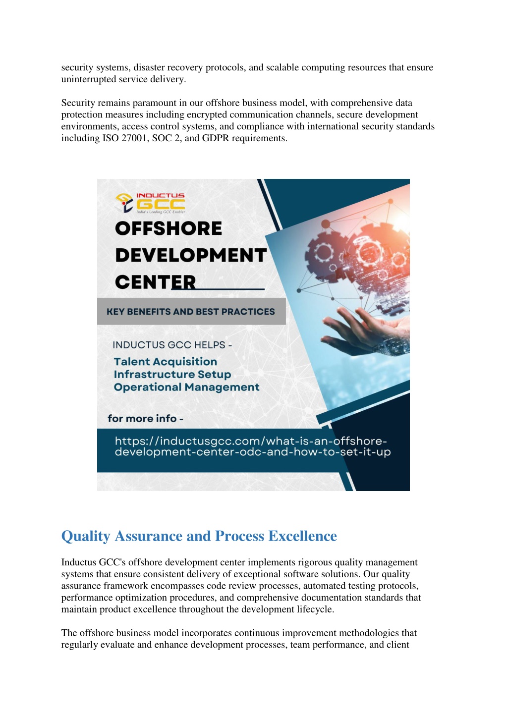 security systems, disaster recovery protocols, and scalable computing resources that ensure uninterrupted service delivery. Security remains paramount in our offshore business model, with comprehensive data protection measures including encrypted communication channels, secure development environments, access control systems, and compliance with international security standards including ISO 27001, SOC 2, and GDPR requirements. Quality Assurance and Process Excellence Inductus GCC's offshore development center implements rigorous quality management systems that ensure consistent delivery of exceptional software solutions. Our quality assurance framework encompasses code review processes, automated testing protocols, performance optimization procedures, and comprehensive documentation standards that maintain product excellence throughout the development lifecycle. The offshore business model incorporates continuous improvement methodologies that regularly evaluate and enhance development processes, team performance, and client
