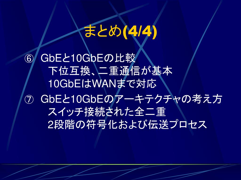まとめ(4/4) • GbEと10GbEの比較 下位互換、二重通信が基本 10GbEはWANまで対応 • GbEと10GbEのアーキテクチャの考え方 スイッチ接続された全二重 2段階の符号化および伝送プロセス