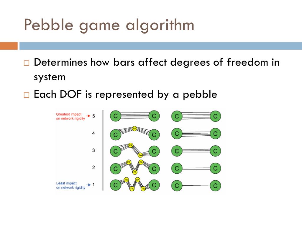 Pebble game algorithm • Determines how bars affect degrees of freedom in system • Each DOF is represented by a pebble