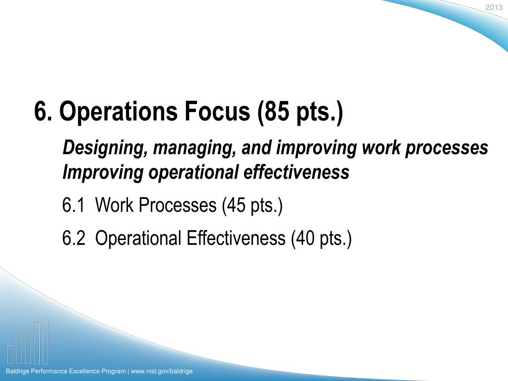6. Operations Focus (85 pts.) Designing, managing, and improving work processesImproving operational effectiveness 6.1 Work Processes (45 pts.) 6.2 Operational Effectiveness (40 pts.)